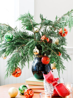 You may not have room for the pine tree of your dreams—but that doesn’t mean you can’t show off your favourite ornaments. Put tiny tabletop surfaces to use by snipping greenery from backyard trees and arranging the stems in a vase. Use the space below the cutting tree to arrange gifts as a tiny alternative to a traditional Christmas tree.